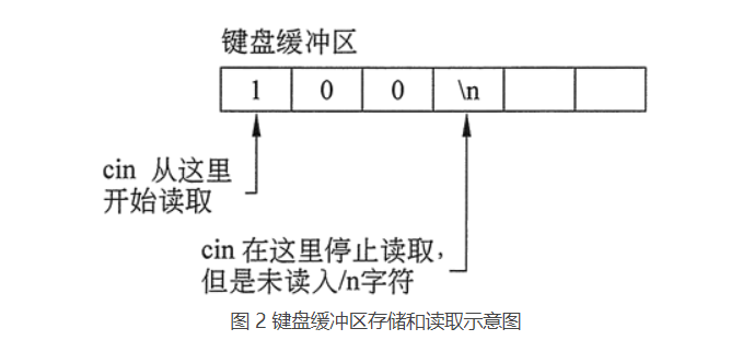在示例代码段中,当执行第 4 行时,用户输入一个数字,然后按回车键。假设输入的是数字 100。按回车键会导致一个换行符(‘\n’)存储在键盘缓冲区数字 100 之后,如图 2 所示。