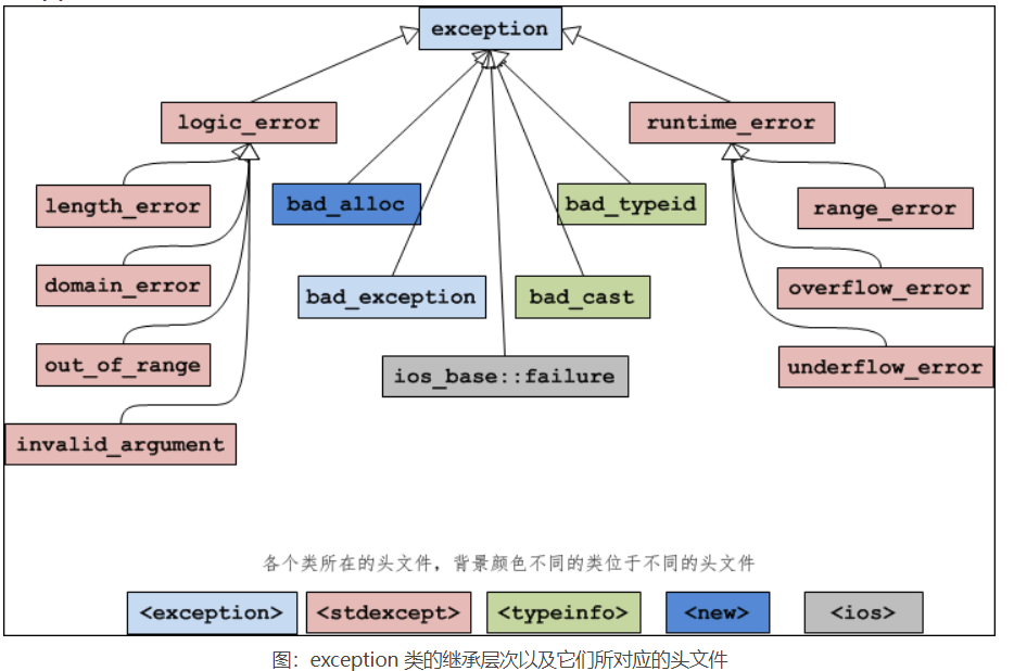 | bad_exception | 这是个特殊的异常,如果函数的异常列表里声明了 bad_exception 异常,当函数内部抛出了异常列表中没有的异常时,如果调用的 unexpected() 函数中抛出了异常,不论什么类型,都会被替换为 bad_exception 类型。 |