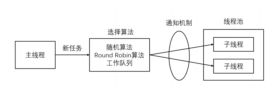主线程使用某种算法来主动选择子线程。最简单、最常用的算法是随机算法和 Round Robin(轮流选取)算法,但更优秀、更智能的算法将使任务在各个工作线程中更均匀地分配,从而减轻服务器的整体压力。主线程和所有子线程通过一个共享的工作队列来同步,子线程都睡眠在该工作队列上。当有新的任务到来时,主线程将任务添加到工作队列中。这将唤醒正在等待任务的子线程,不过只有一个子线程将获得新任务的”接管权“,它可以从工作队列中取出任务并执行之,而其他子线程将继续睡眠在工作队列上。线程池的一般模型为: